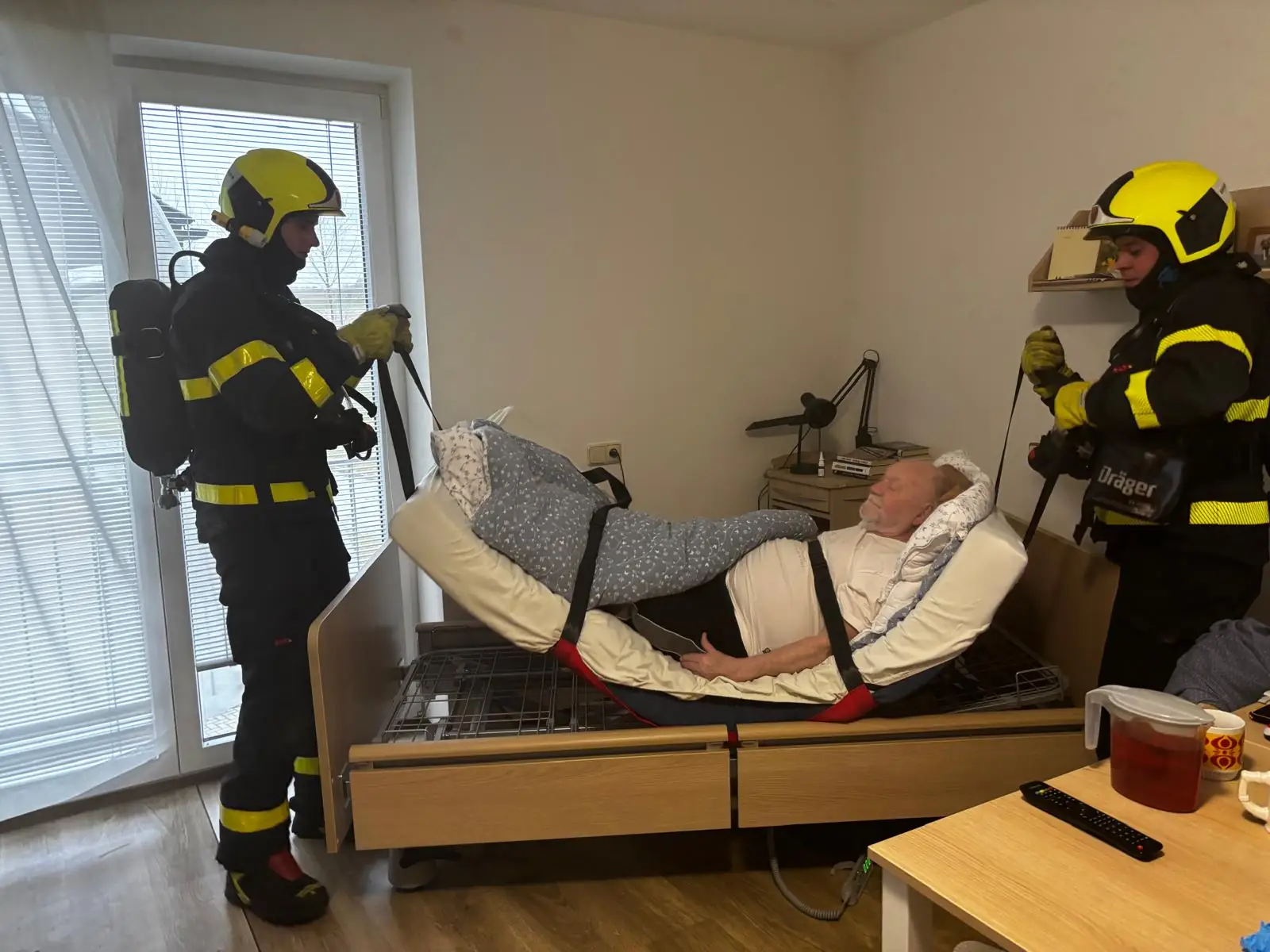 V ALZHEIMER HOME Kateřinice dnes proběhl cvičný požární poplach s profesionálními hasiči města Kopřivnice.🧑🚒 Klienti včetně personálu celou evakuaci zvládli na jedničku. Nácvik byl včetně transportu zraněné osoby z místnosti, kde požár vypukl. Hasiči také provedli přesun imobilního klienta pomocí evakuační podložky až do vstupní haly.🔥