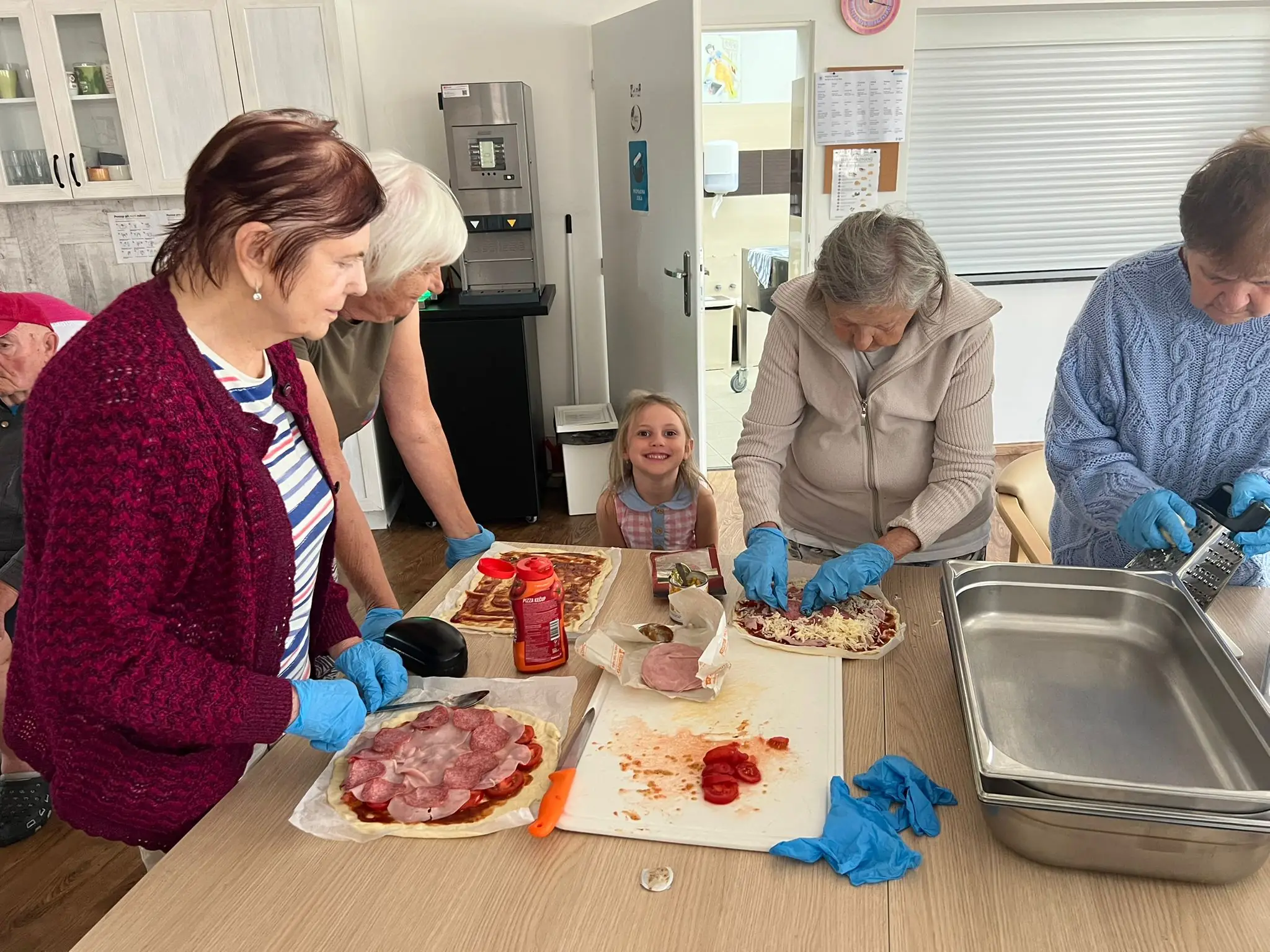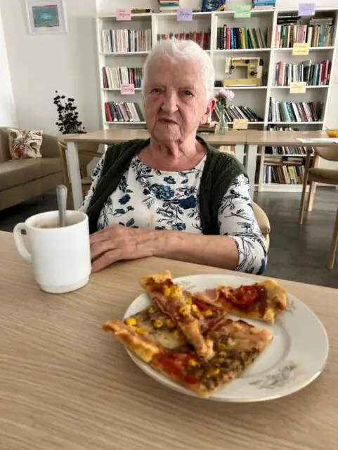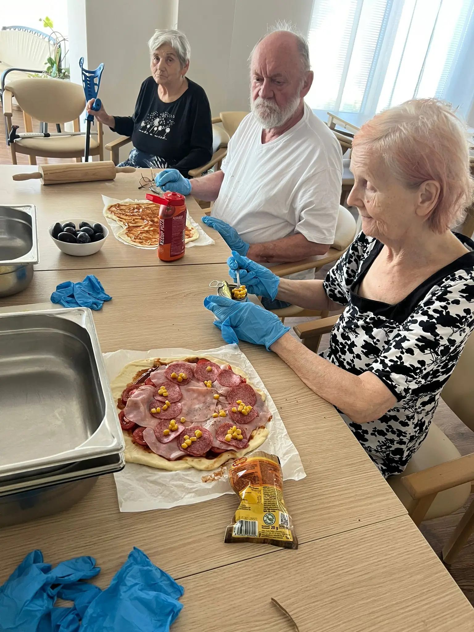 Protože jsme dnes v ALZHEIMER HOME Kateřinice měli výborný sladký oběd, k odpolednímu posezení u kávy jsme si upekli něco slaného. Společnými silami jsme připravili celkem čtyři bohatě obložené pizzy! 🍕
