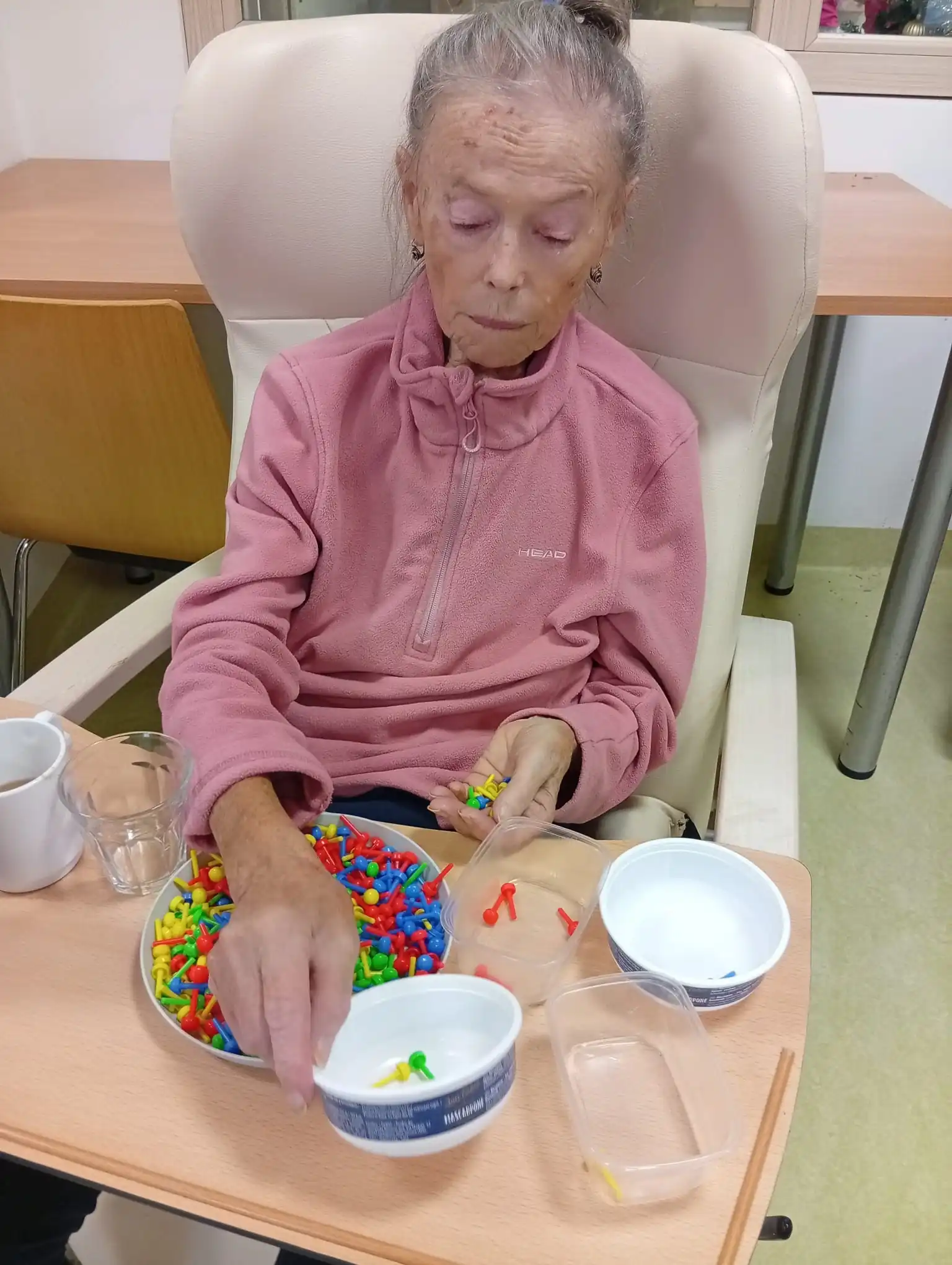 Na programu bylo například rozdělování drobných předmětů, skládání drobných předmětů nebo práce s různými materiály. Tyto činnosti jsou nesmírně důležité, protože pomáhají udržovat soběstačnost při oblékání či jídle, a navíc stimulují mozek a soustředění.